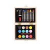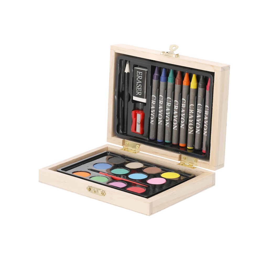 Der elegante Holz-Kasten überzeugt nicht nur durch seine ansprechende beige Farbgebung, sondern auch durch seine solide Bauweise mit robusten Metallscharnieren. Das Set beinhaltet 24 sorgfältig ausgewählte Teile: einen Bleistift, einen Radiergummi, einen Anspitzer, acht Buntstifte in verschiedenen Farben, einen Pinsel und zwölf Wasserfarben. Jede Komponente wurde mit dem Ziel entwickelt, die kreative Ader jedes Nutzers zu fördern und zu inspirieren.